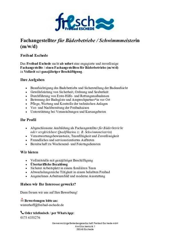 Fachangestellte/r für Bäderbetriebe (m/w/d) in Vollzeit - ganzjährige Beschäftigung